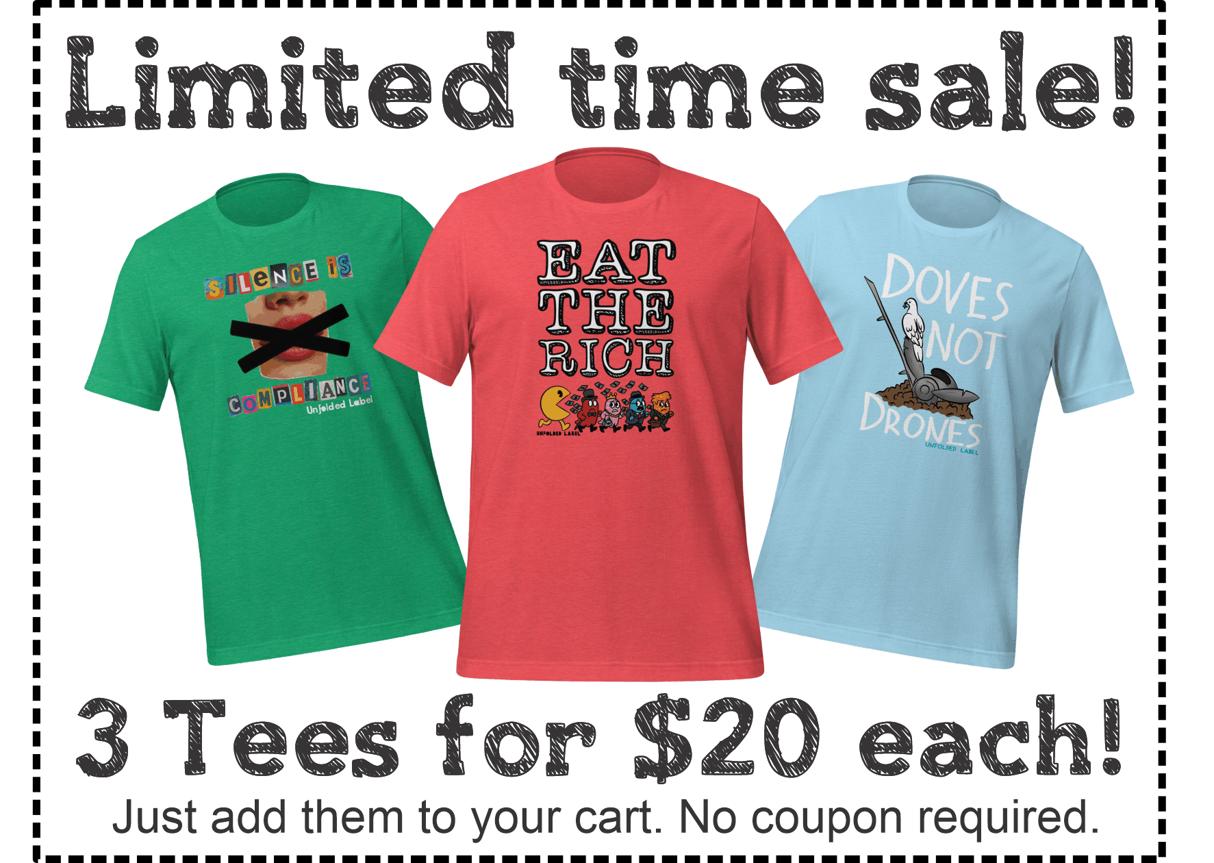 Larger sizes, raglans and long sleeves get $2 off per shirt when you buy 3.